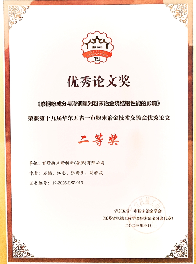 参会论文《渗铜粉成分与渗铜量对粉末冶金烧结钢性能的影响》被评为交流会优秀论文二等奖。