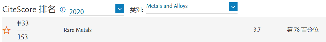 《稀有金属(英文版)》(Rare Metals)CiteScore 2020:3.7,较2019年度(2.9)提升27.6%,位于Metals and Alloys学科Q1区(33/153),较2019年度(38/152)提升5名。