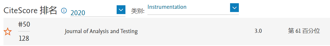 《分析检测(英文)》(Journal of Analysis and Testing) CiteScore 2020:3.0,较2019年度(1.8)提升66.7%,位于Instrumentation学科Q2区(50/128),较2019年度(84/129)提升34名。