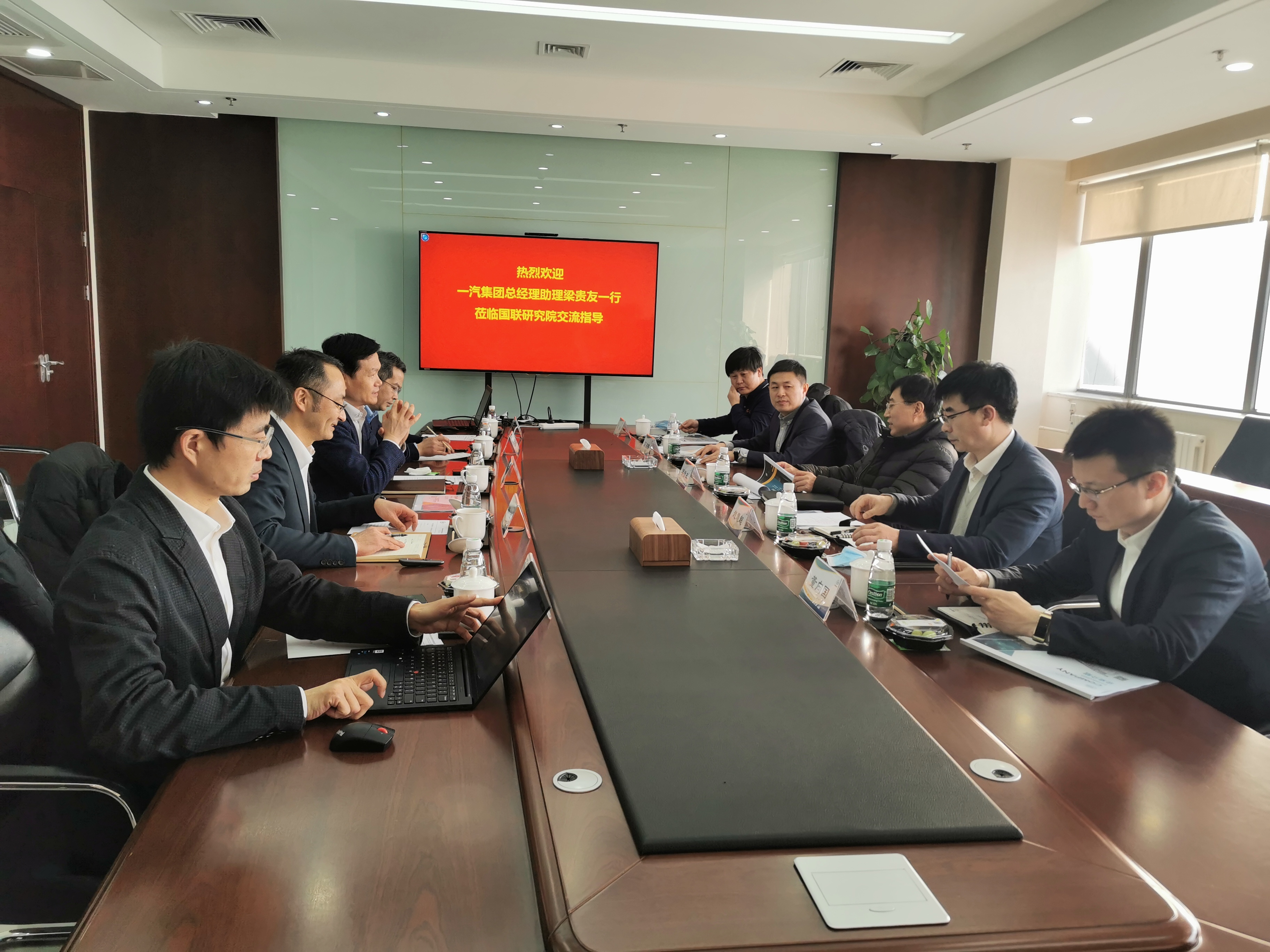 2月18日,一汽集团总经理助理梁贵友,一汽集团新能源开发院院长赵慧超、智能网联开发院副院长高洪伟一行到访国联研究院,有研集团副总经理、国联研究院董事长黄倬,国联研究院党委书记、总经理徐冉,国联研究院副总经理张向军、副总经理王建涛陪同参观并座谈交流。