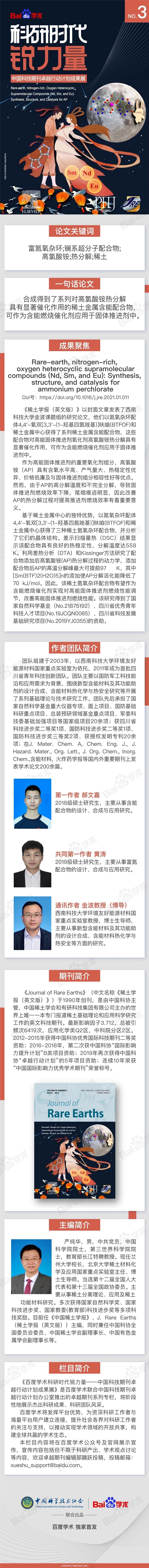 5月12日,由有研集团主办、有科出版运营的《稀土学报(英文版)》入选“科研时代锐力量—中国科技期刊卓越行动计划成果展”系列专栏(第3期),该期专题介绍了《稀土学报(英文版)》2022年第3期封面文章《稀土、富氮、氧杂环超分子化合物(Nd、Sm和Eu)的合成、结构及对高氯酸铵的催化作用》(《Rare-earth, nitrogen-rich, oxygen heterocyclic supramolecular compounds (Nd, Sm, and Eu): Synthesis, structure, and catalysis for ammonium perchlorate》)相关研究成果及科研团队。入选成果展将进一步扩大期刊的影响力,展示主编风采。