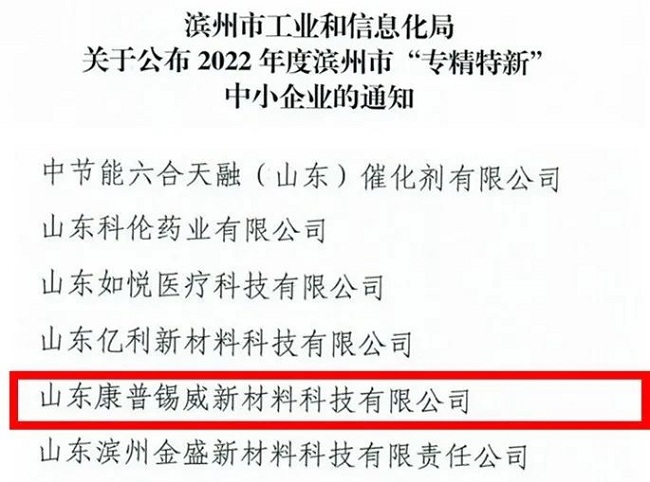 5月份,山东省滨州市工业和信息化局公布了2022年度滨州市“专精特新”中小企业名单,有研粉材所属公司山东康普锡威新材料科技有限公司榜上有名。