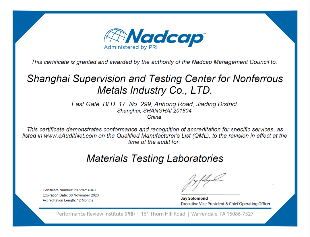 上海有色金属工业技术监测中心有限公司于2022年12月6日顺利通过美国质量工程协会(PRI,Performance Review Institute)组织的Nadcap认证审核,并获得Nadcap-MTL(材料测试实验室)认证资质证书。